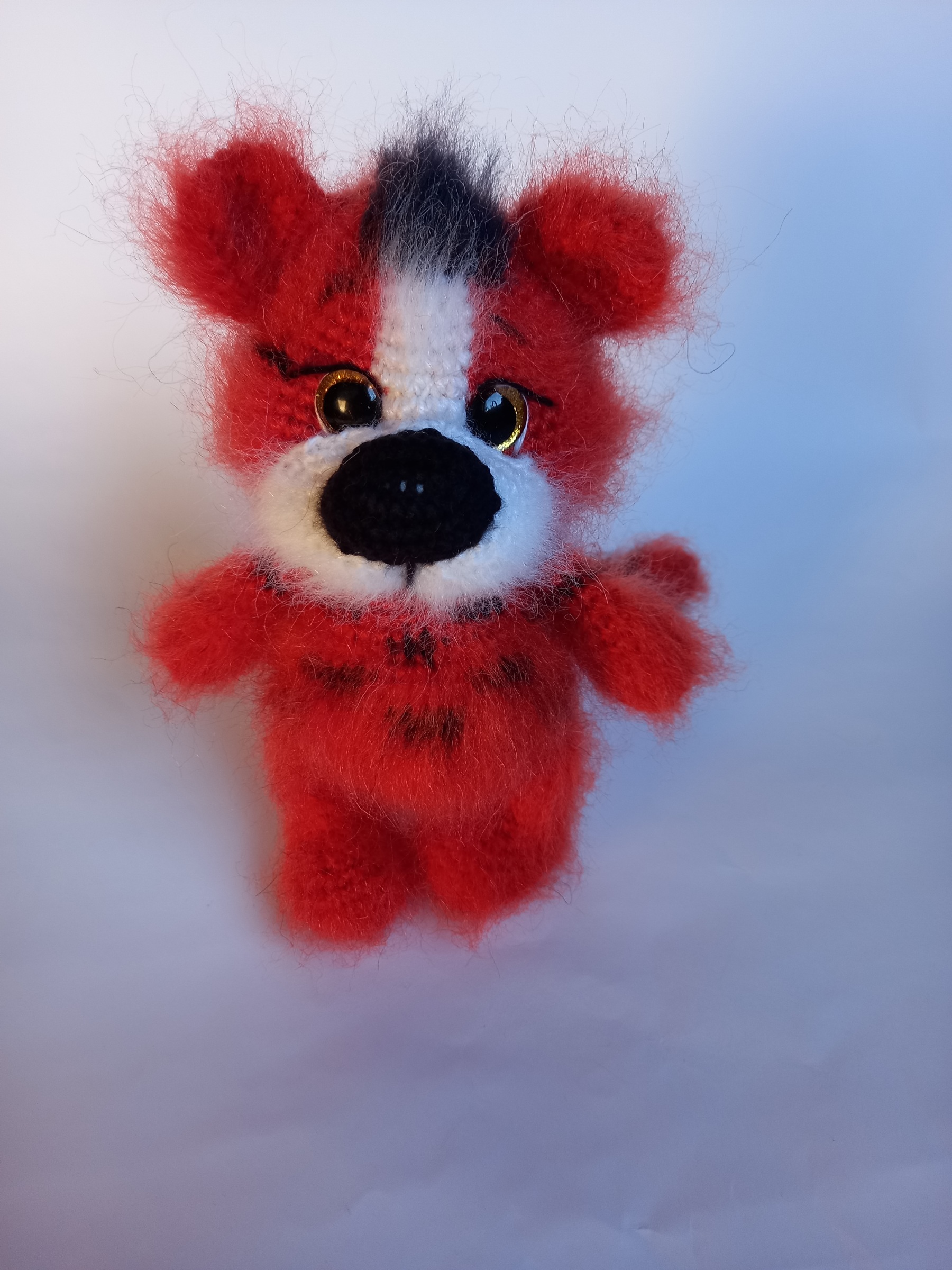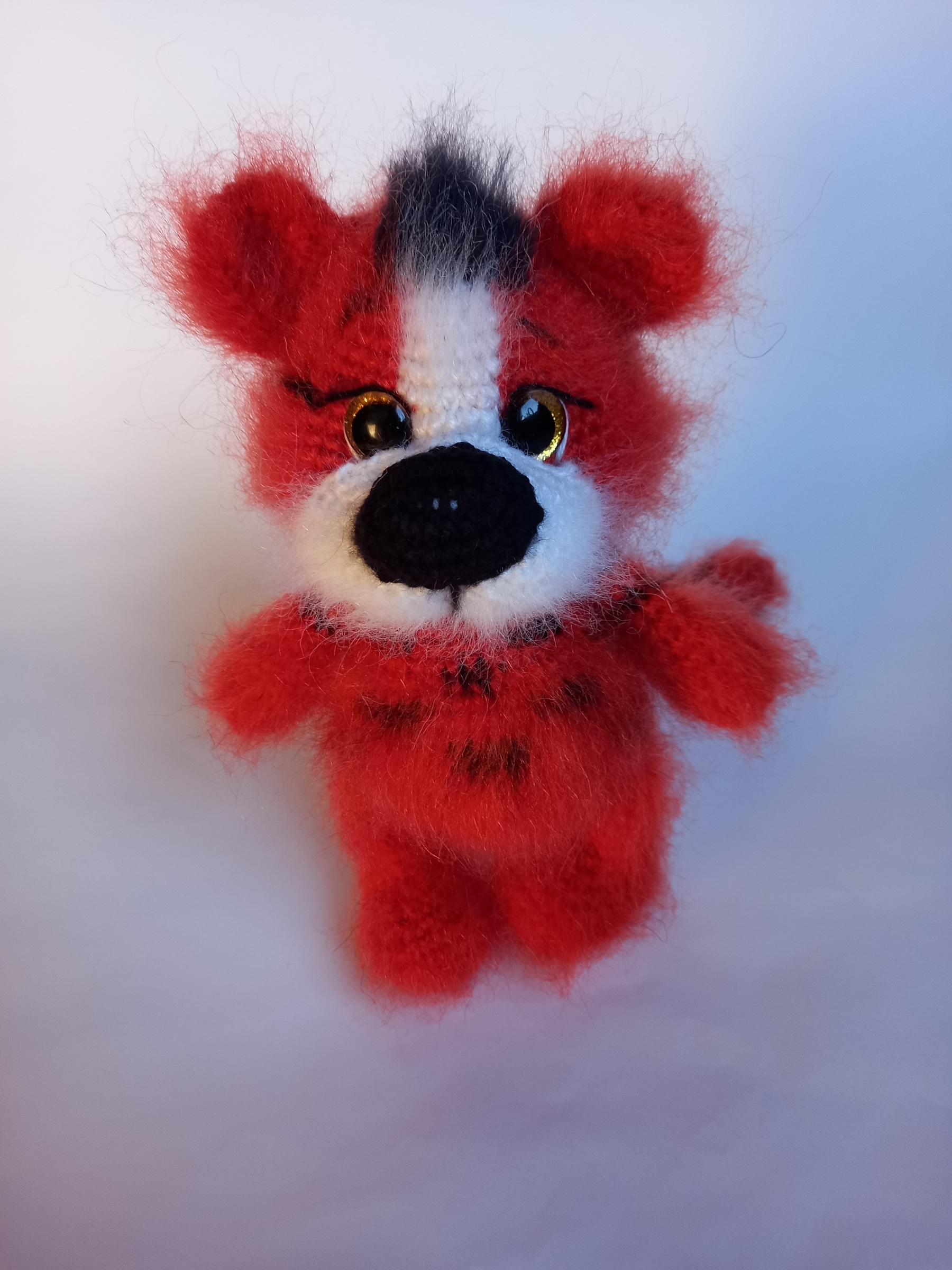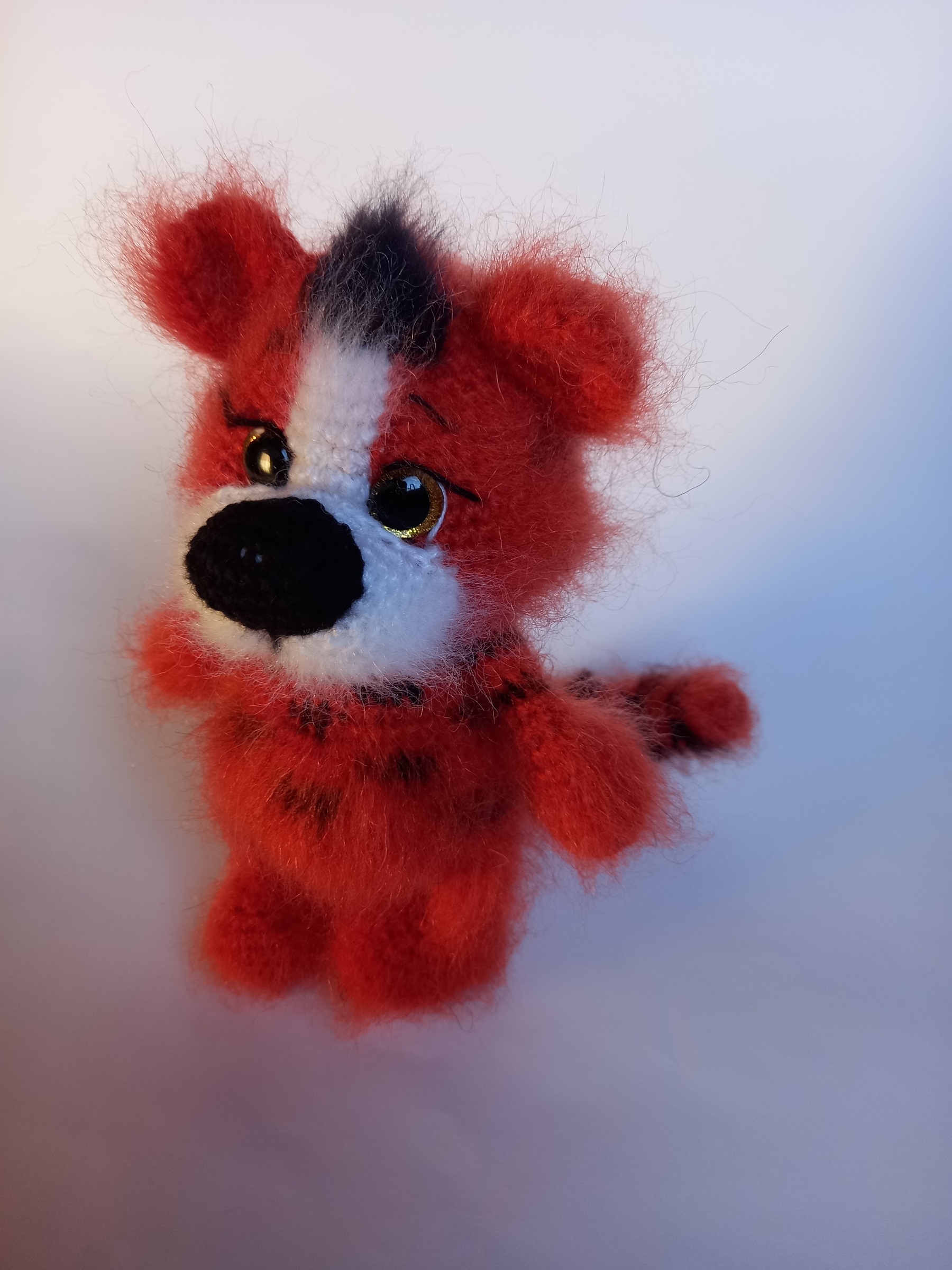 Šis rankų darbo nertas interjerinis moherinis tigriukas sukurtas kaip dekoratyvinė namų interjero detalė.