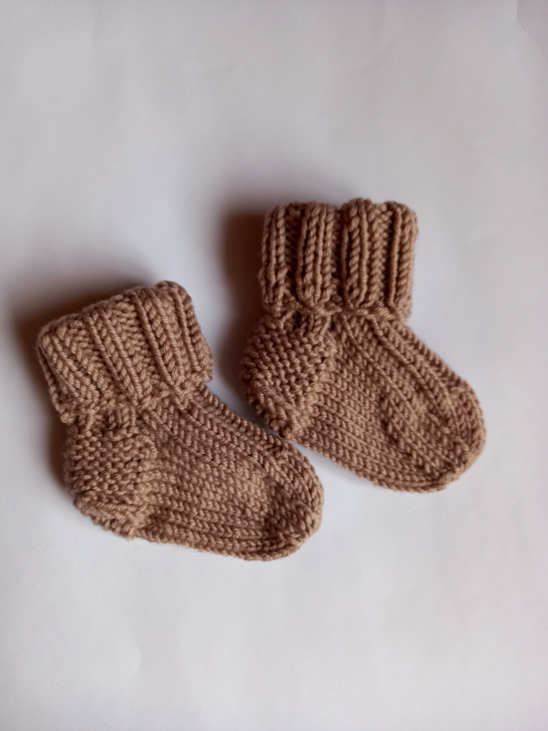 Minkštos ir šiltos merino vilnos kojinytės – megztos rankomis su meile. Tinka 0–3 mėn. kūdikiui. Natūralus pluoštas švelnus, kvėpuojantis ir nesukelia alergijų.
