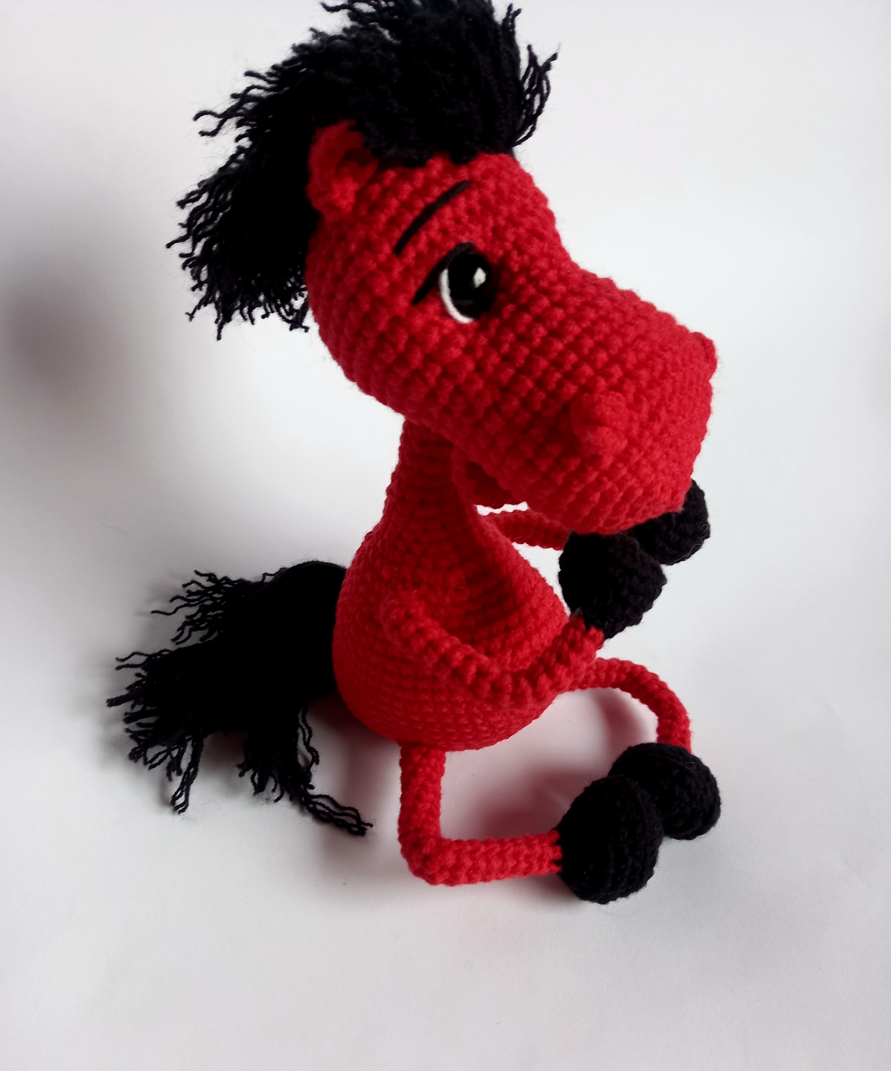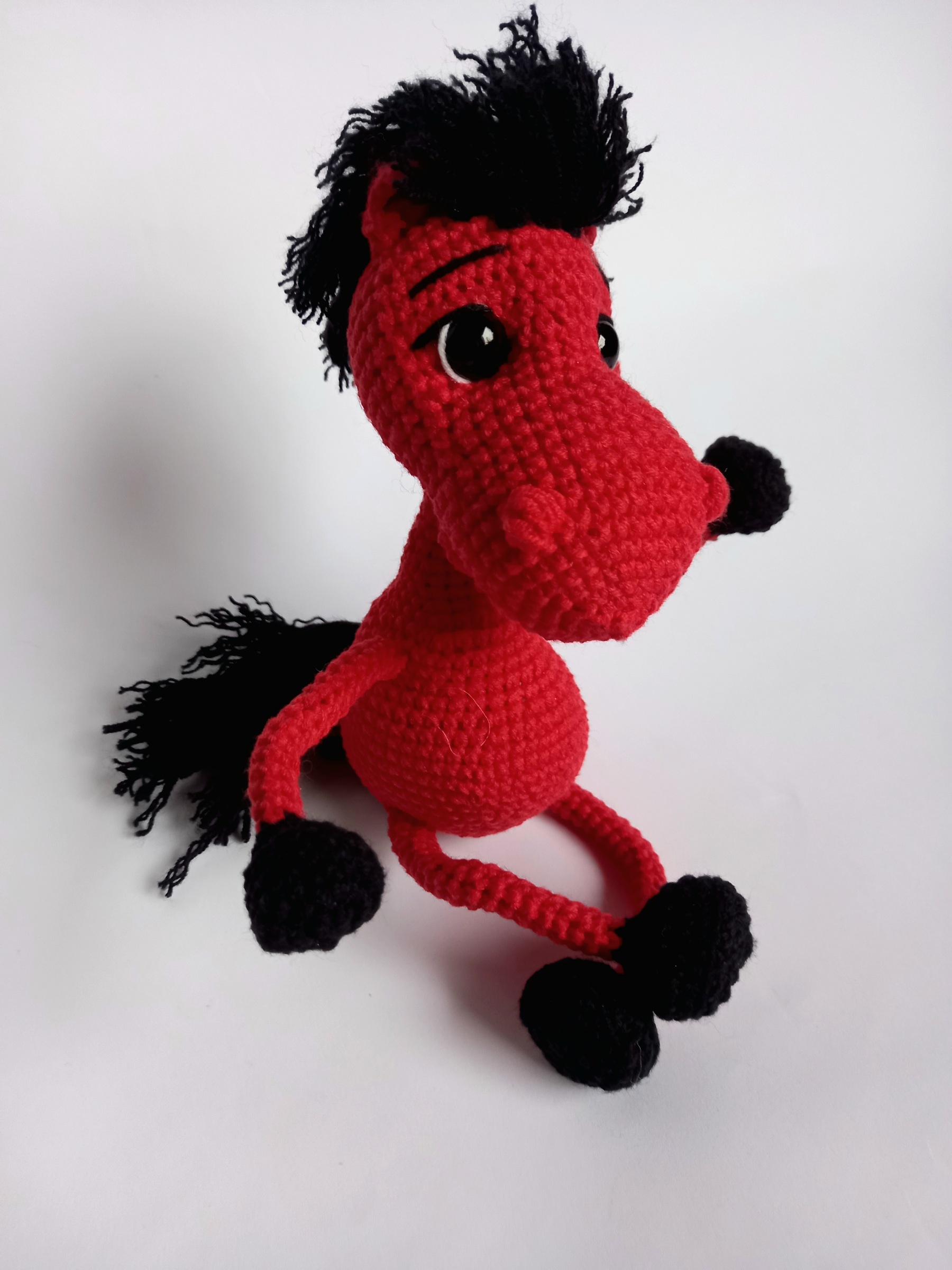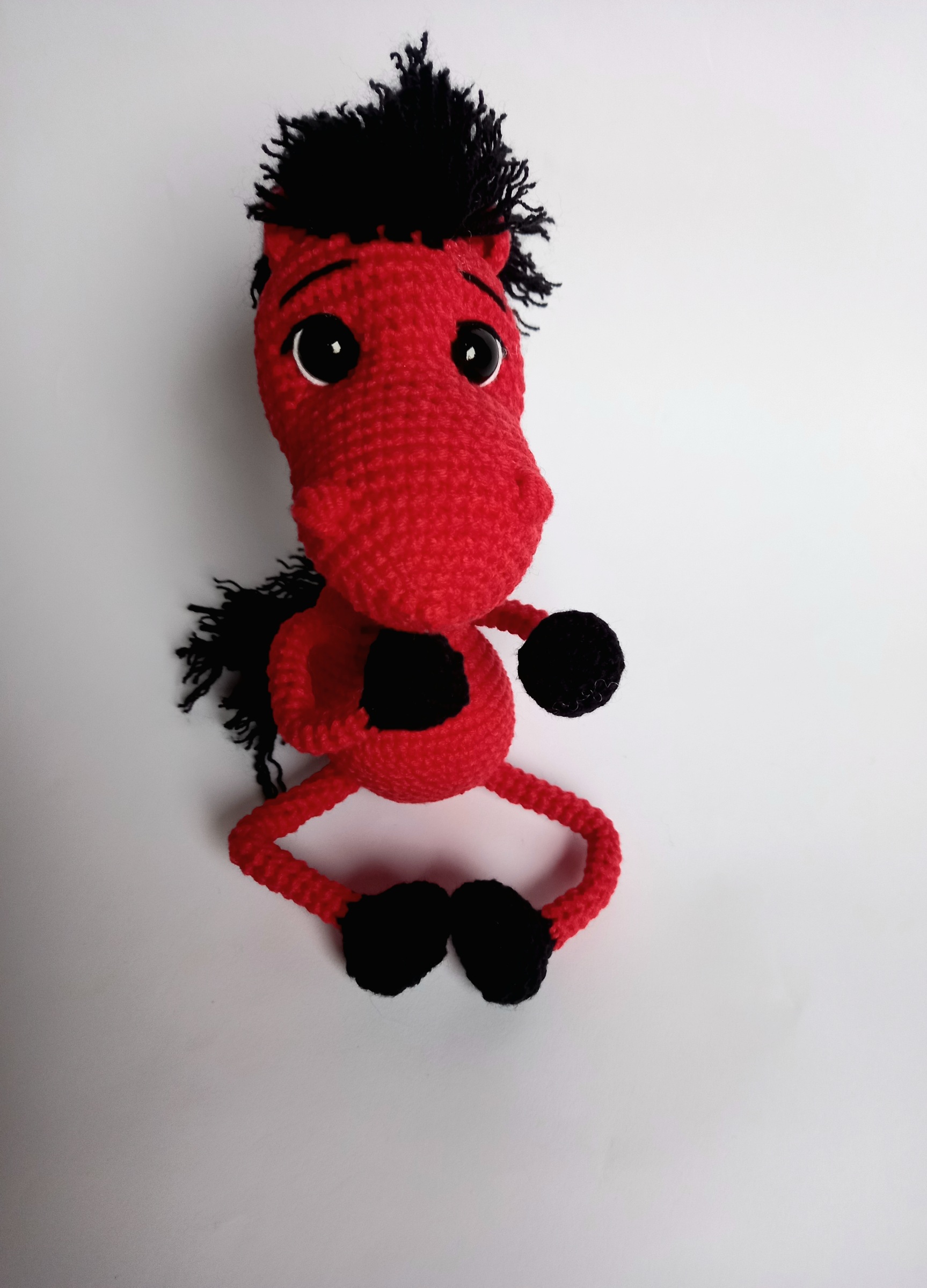 Rankų darbo nertas interjerinis žaislas Raudonas Arkliukas