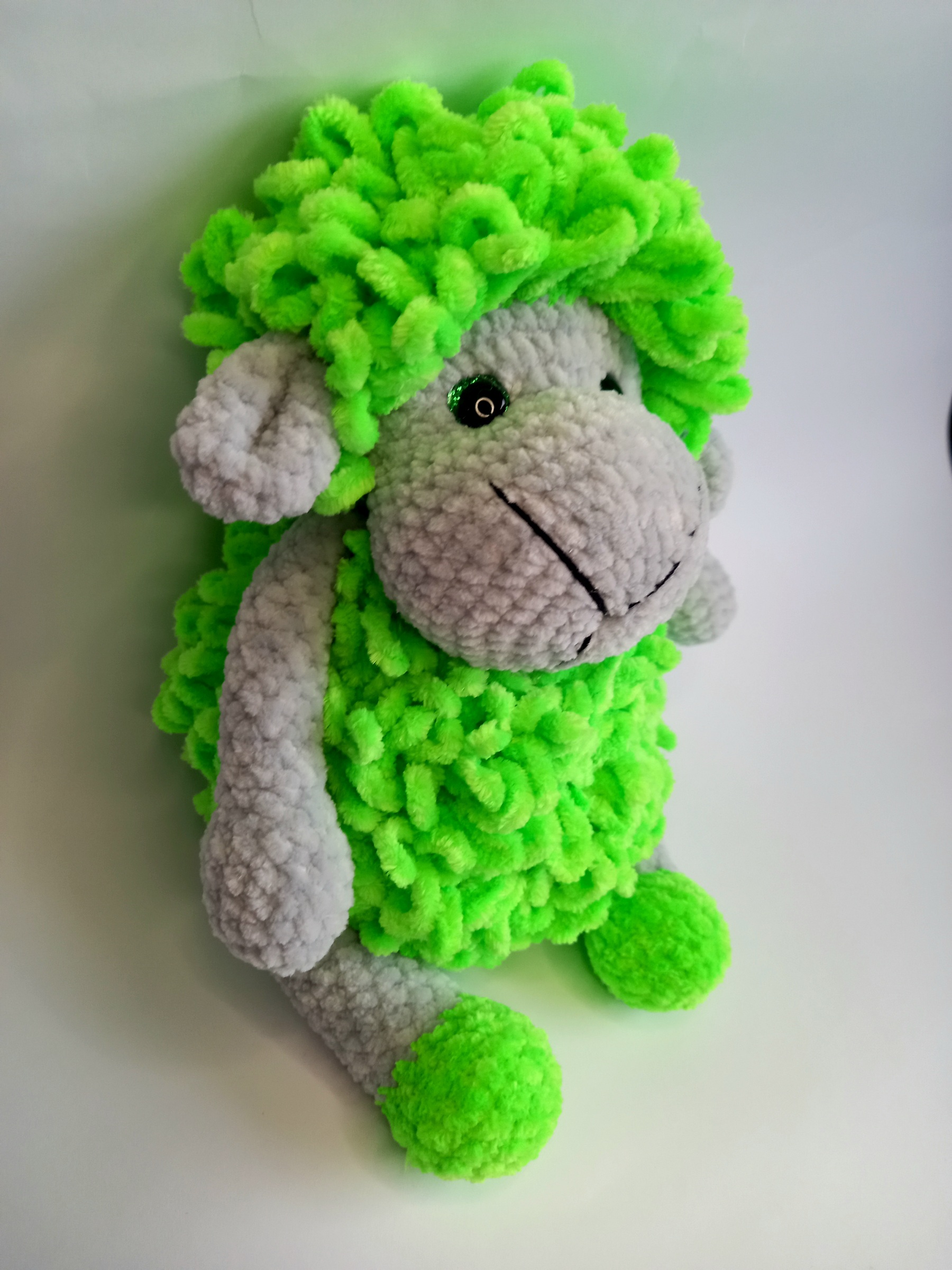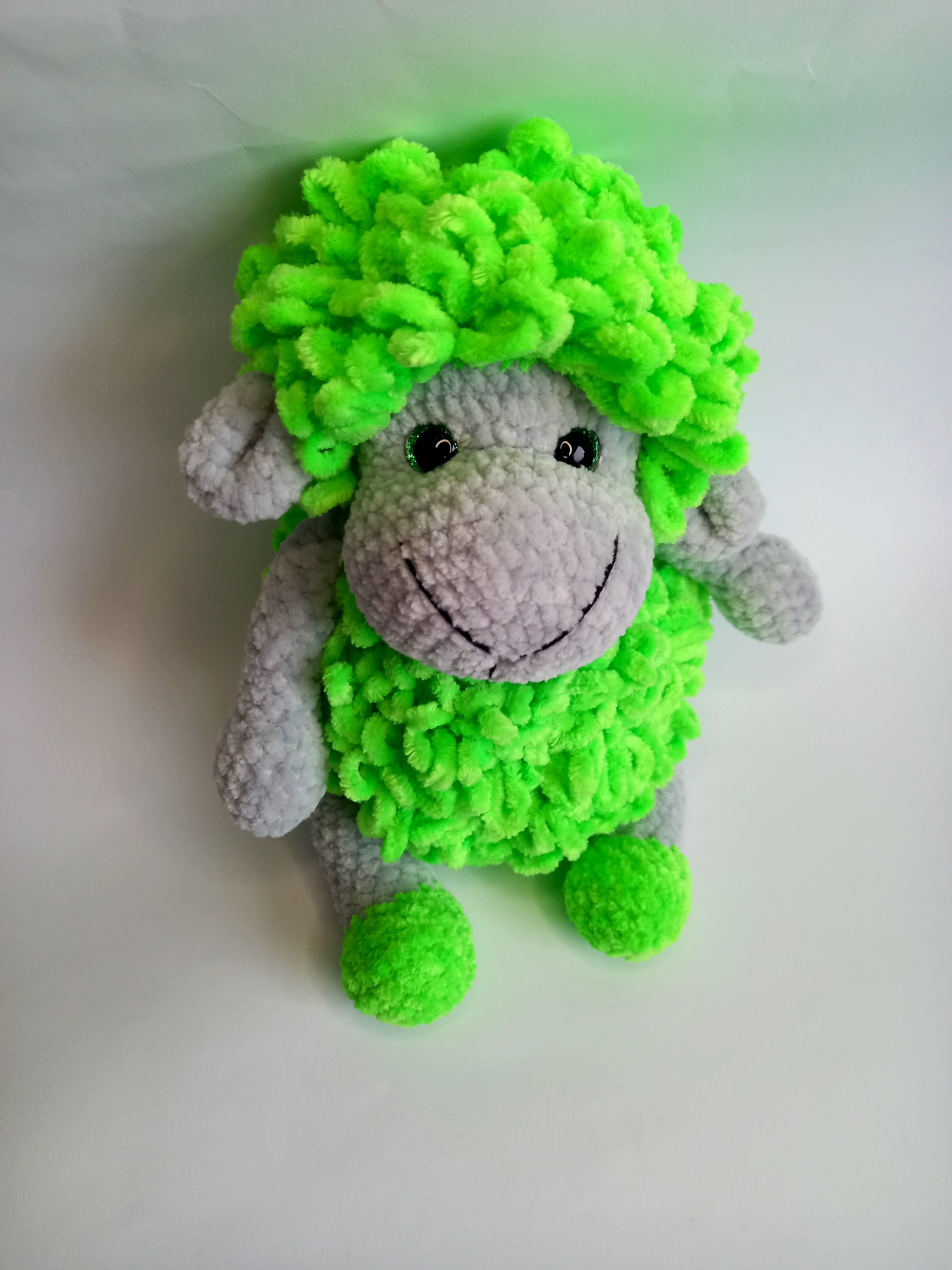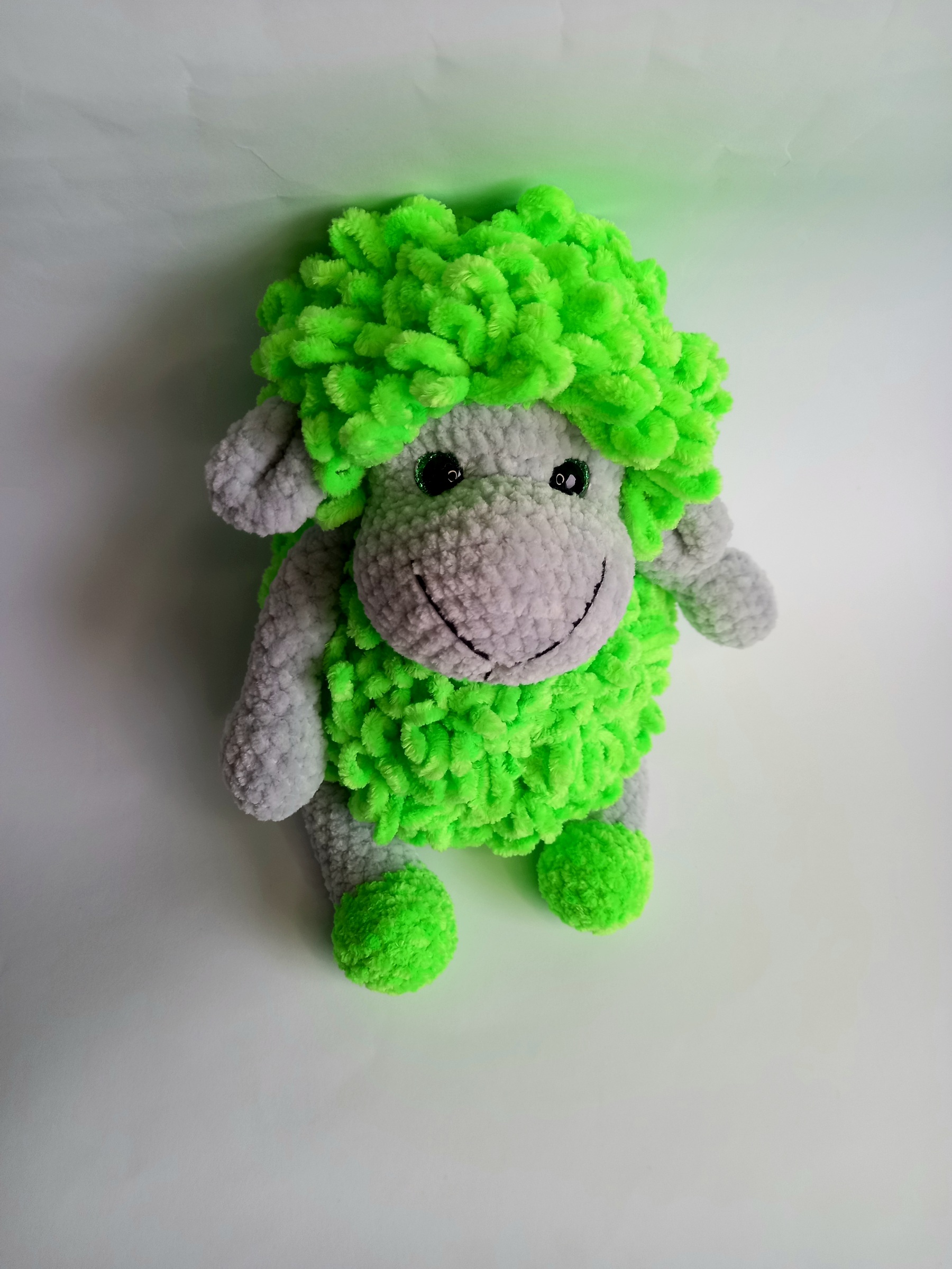 Maždaug 27 cm dydžio ryškiai žalia nerta avytė. Minkšta, saugi ir žaisminga — pagaminta iš OEKO-TEX siūlų. Tinka dovanai ar jaukiems žaidimams.