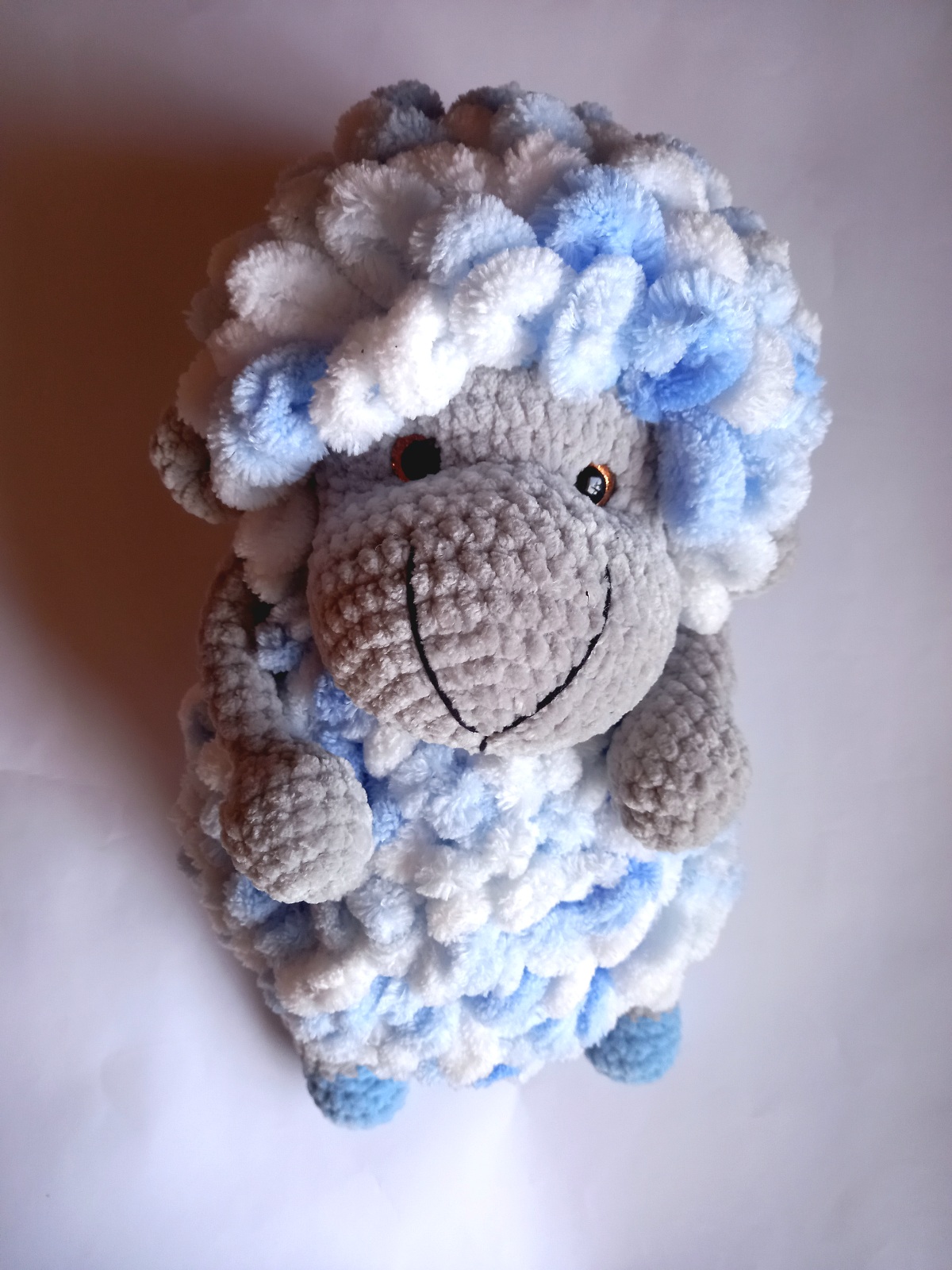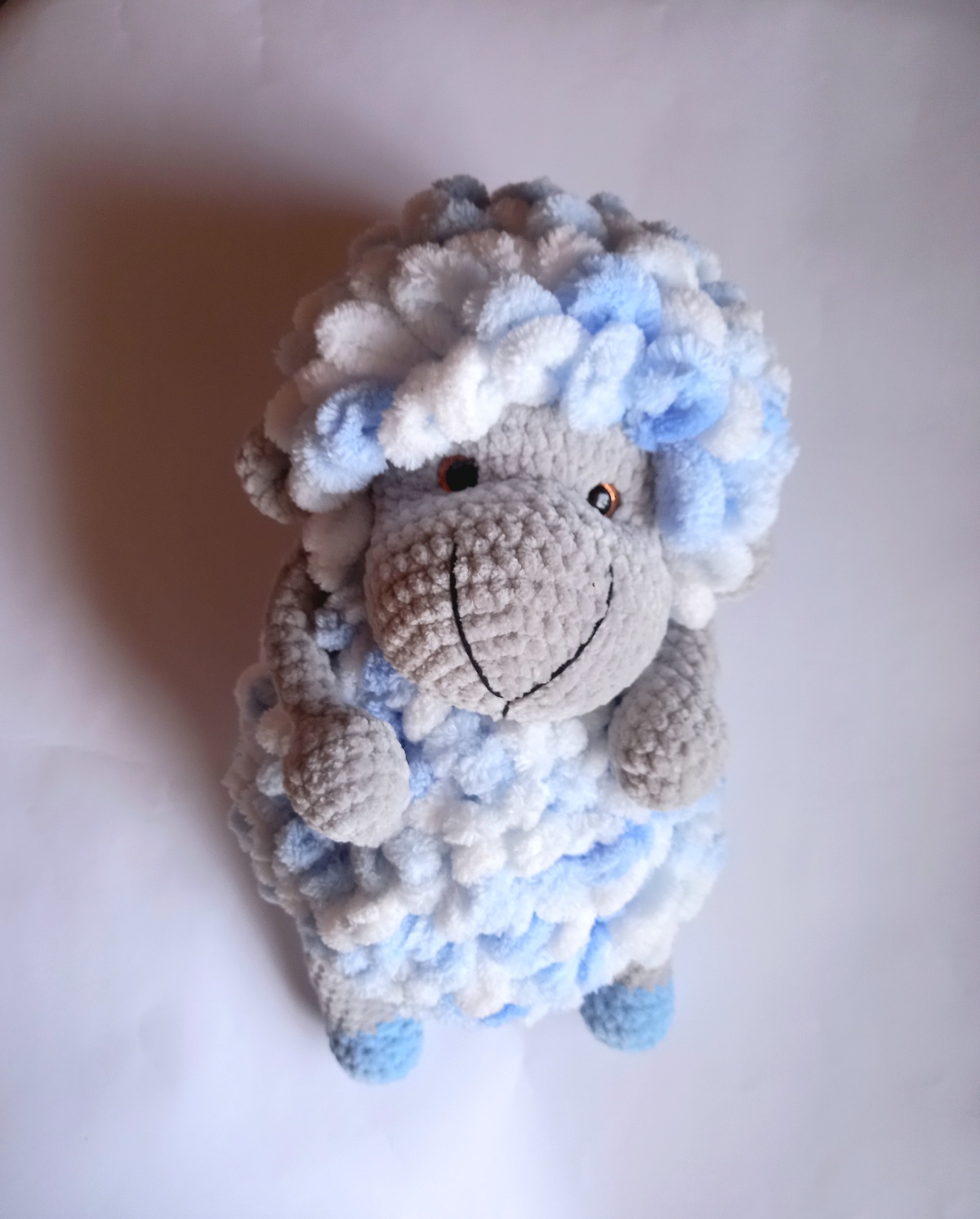 Šis vidutinio dydžio melsvai margas aviukas – švelnus, rankų darbo nertas žaislas, pagamintas iš minkštų, saugių siūlų.