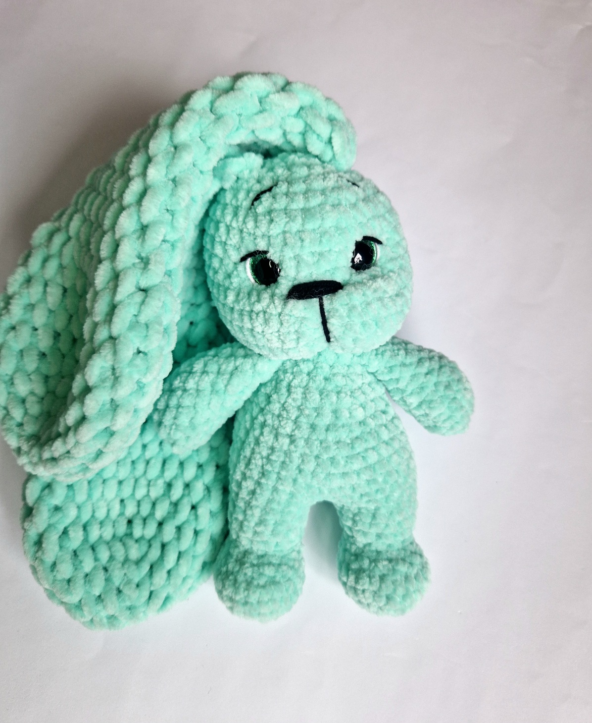 Rankų darbo nertas žaislas Mėtinė Kiškutė "Kruopytė"