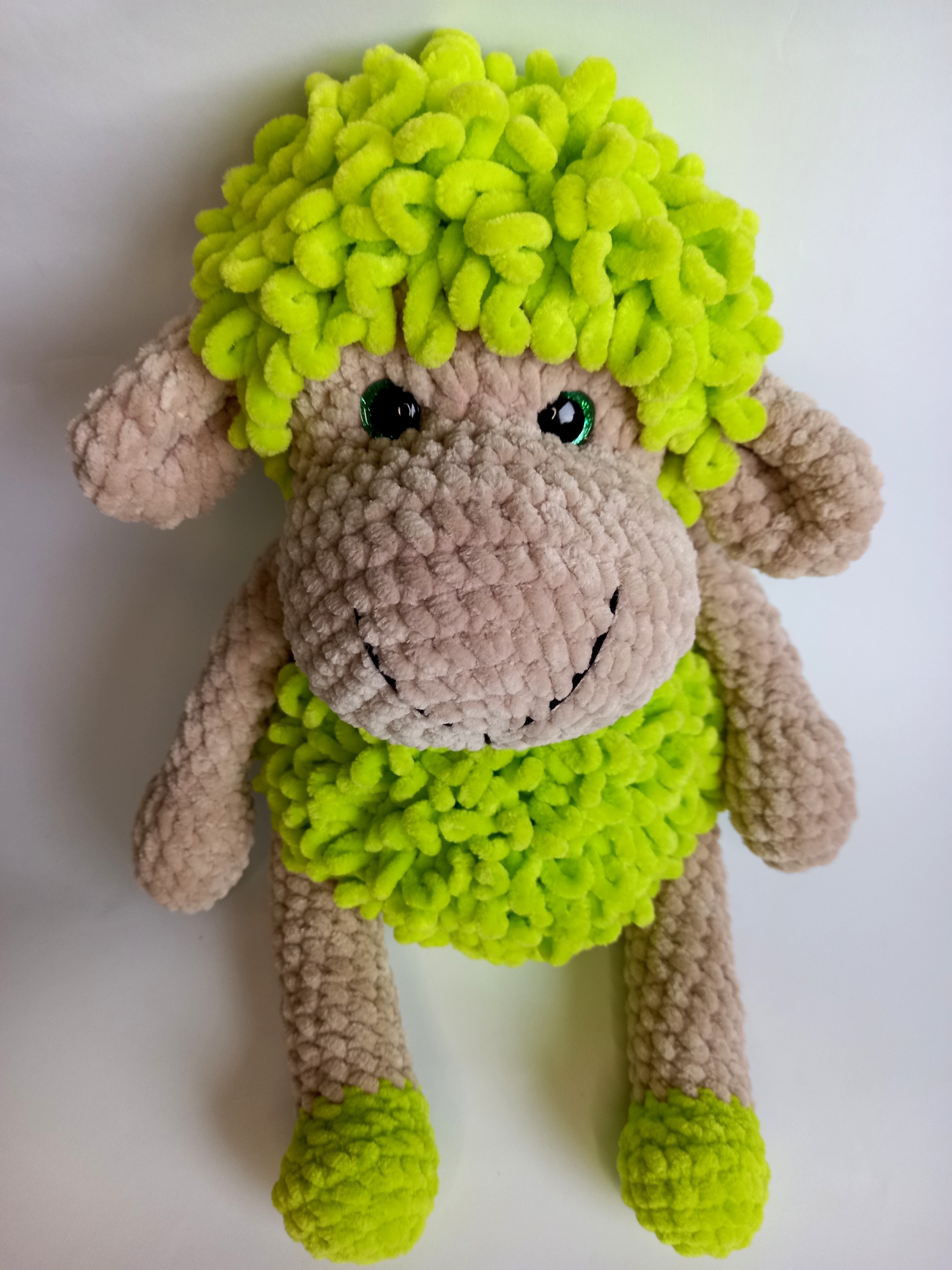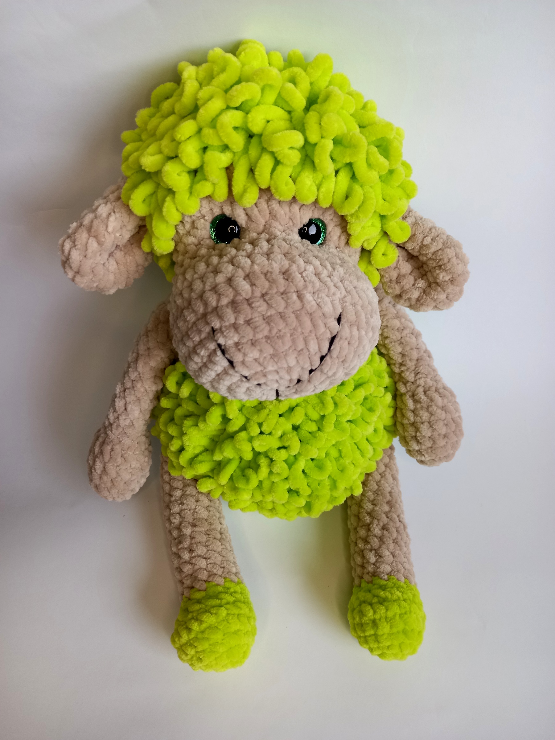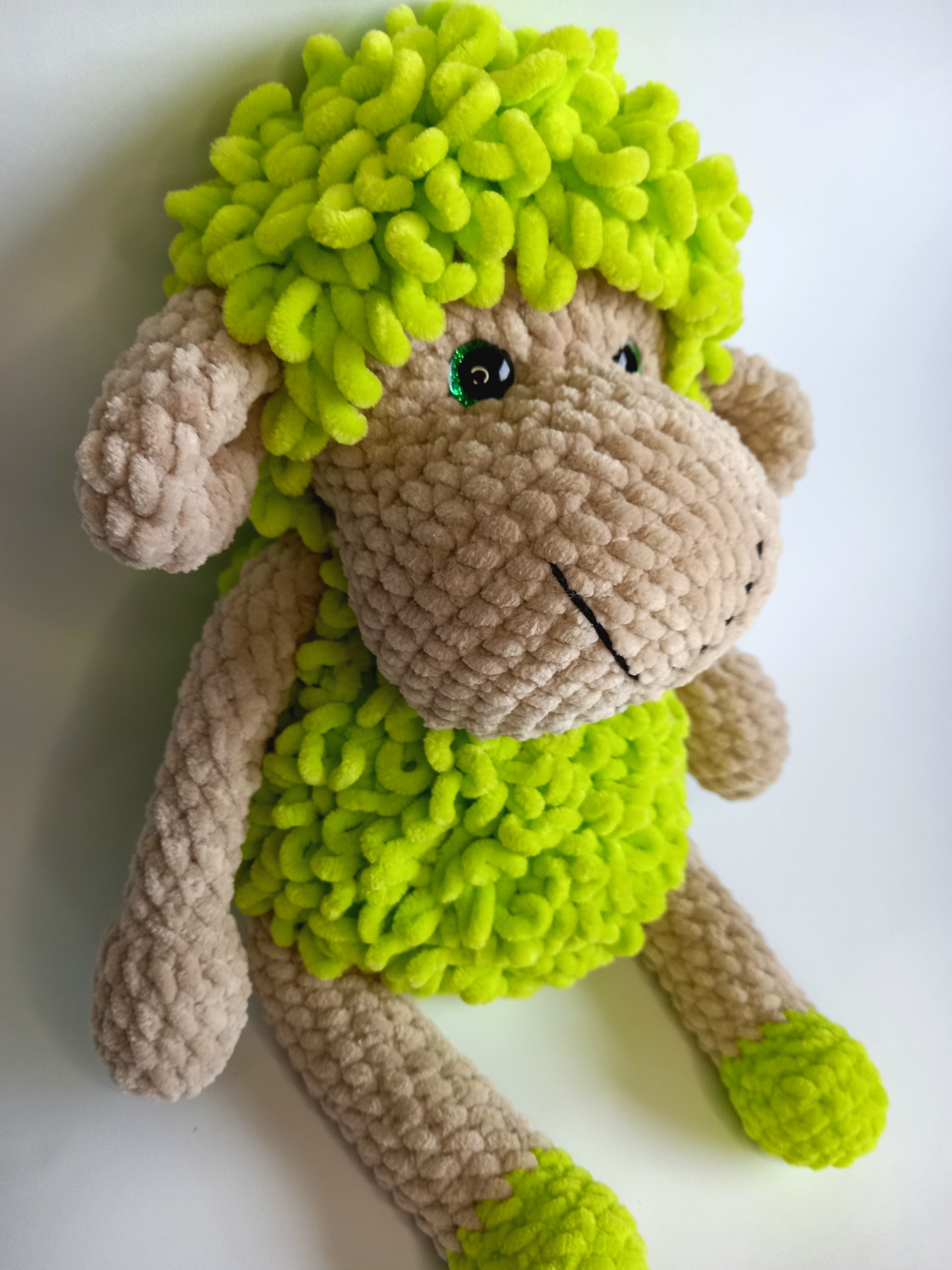 Rankų darbo ryškiai žalia avytė, maždaug 35 cm dydžio. Minkšta, šilta ir žaisminga – pagaminta iš kokybiškų OEKO-TEX siūlų, tinkama vaikams
